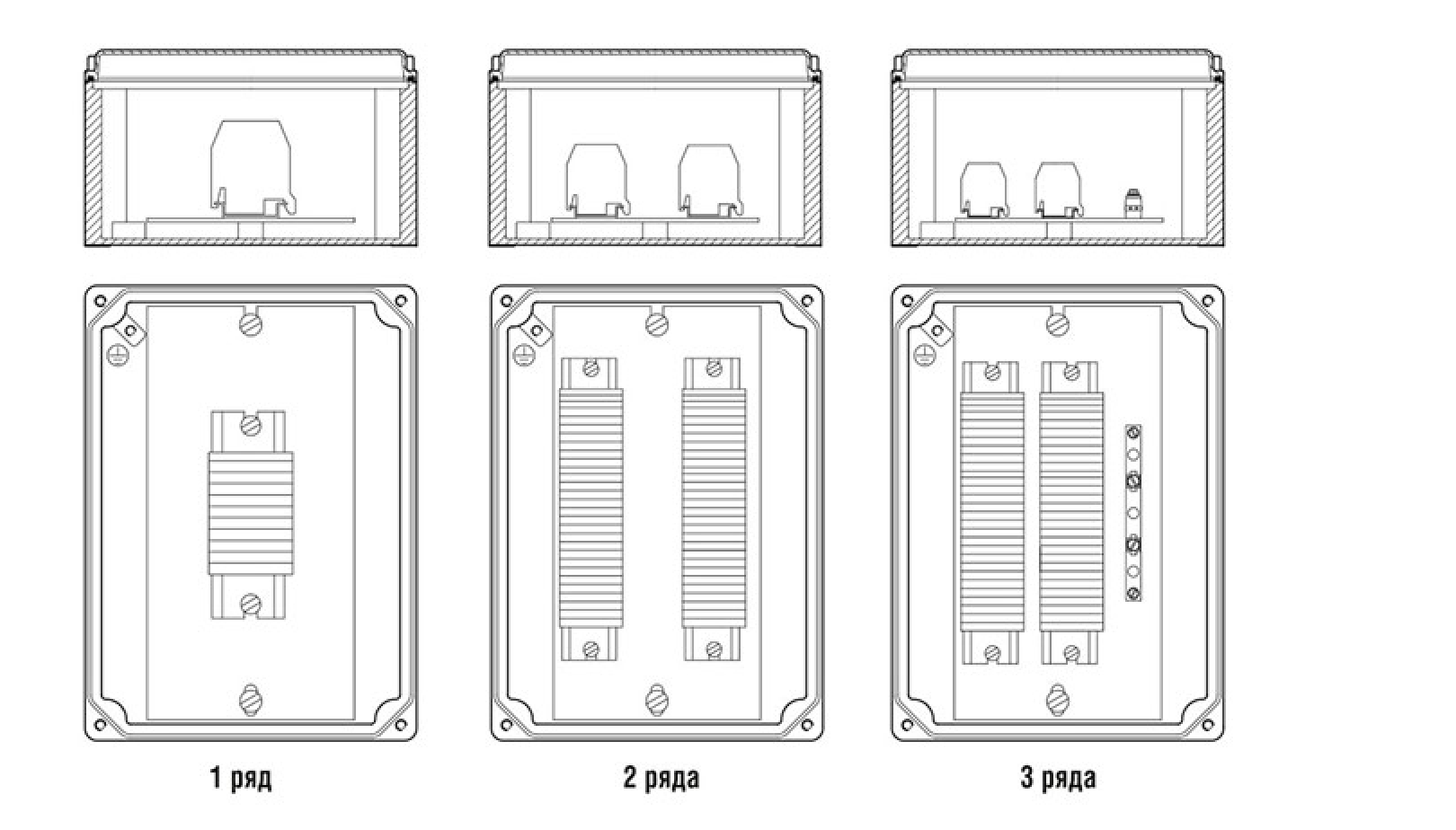 Клеммные блоки устанавливаются на шинах DIN и крепятся на монтажной пластине внутри коробки. Монтажная пластина изготавливается из алюминиевого сплава. Корпуса имеют внешний болт заземления, выполненный из нержавеющей стали.
