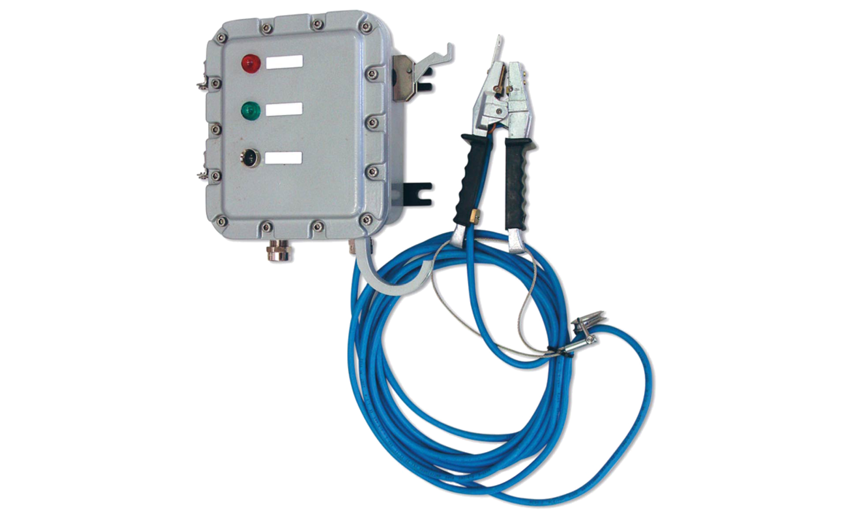 Красная лампа горит до тех пор, пока зажим заземления не подключен к шине заземления цистерны и кнопка «Включение» нажата, по крайней мере, в течение двух секунд. Если измеренное сопротивление меньше 20 Ом, система контроля дает разрешение на выгрузку/загрузку цистерны. Заземляющий зажим обычно комплектуется кабелем длиной 8 м.