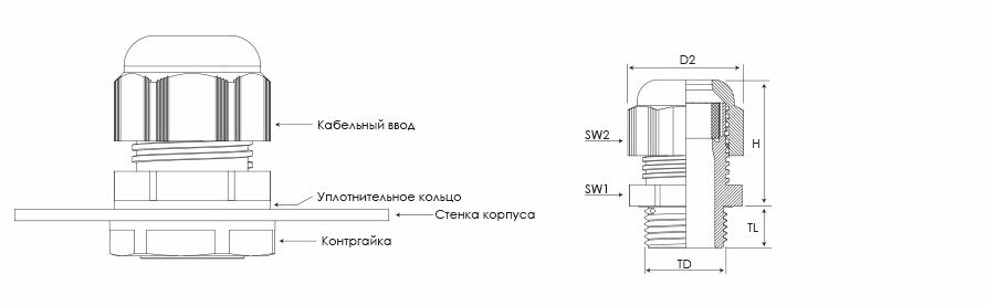 Кабельные вводы состоят из корпуса (муфты) и нажимной гайки. Уплотнительные кольца, предназначенные для уплотнения кабеля в теле ввода, выполнены из силиконовой резины. Для предотвращения попадания пыли в корпус, кабельные ввода укомплектованы заглушками.