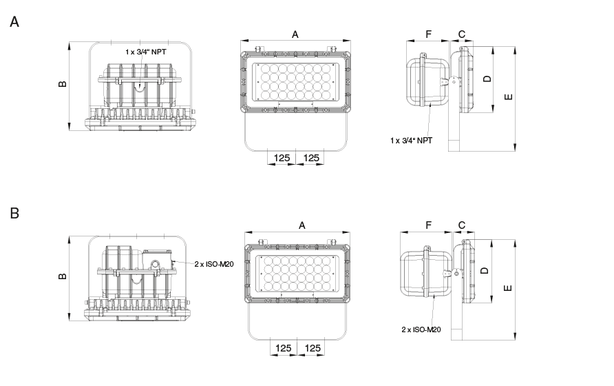 Подключение к клеммам производится внутри оболочки, в задней части корпуса. Максимальное сечение кабелей для подключения должно составлять 4 мм2. Светильники имеют два резьбовых ввода для кабеля.