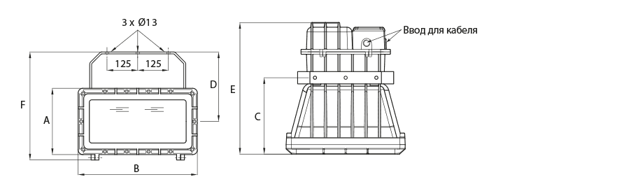 Конструкция прожектора позволяет реализовать схему питания вход/выход. Прожекторы имеют 3 резьбовых ввода для кабеля. Стандартная резьба ¾ NPT (ANSI/ASME В1.20.1).