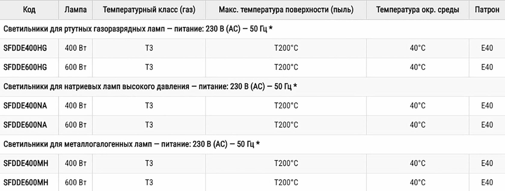 В прожекторах применяются ртутные газоразрядные лампы, натриевые газоразрядные лампы высокого давления и металлогалогенные лампы мощностью до 600 Вт с ПРА для напряжения 230 В (АС) — 50 Гц.