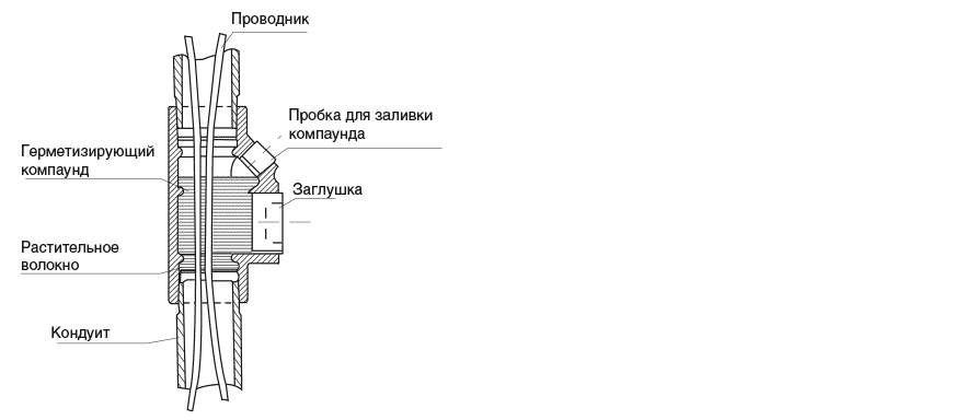 Разделительный фитинг, заполненный специальным герметиком (компаундом), должен устанавливаться как можно ближе к взрывозащищенным Ex d корпусам разветвительных коробок, шкафов управления, светильников. Разделительные фитинги используются для разделения внутреннего пространства взрывонепроницаемых корпусов электрооборудования, включая светильники, от внутреннего пространства трубной системы электропроводки.